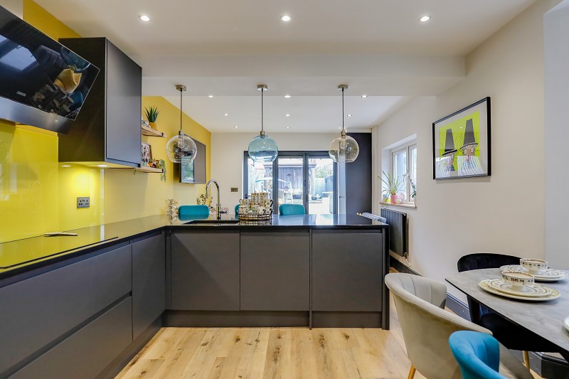 A pair of side windows allow generous levels of natural light, as do bi-folding doors which open onto the decked terrace.