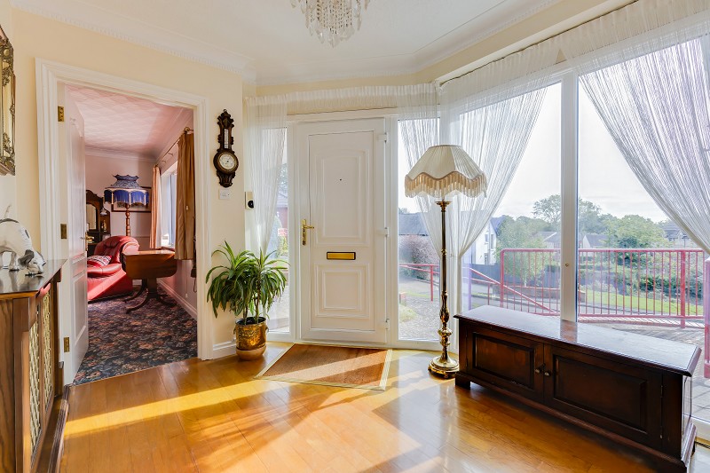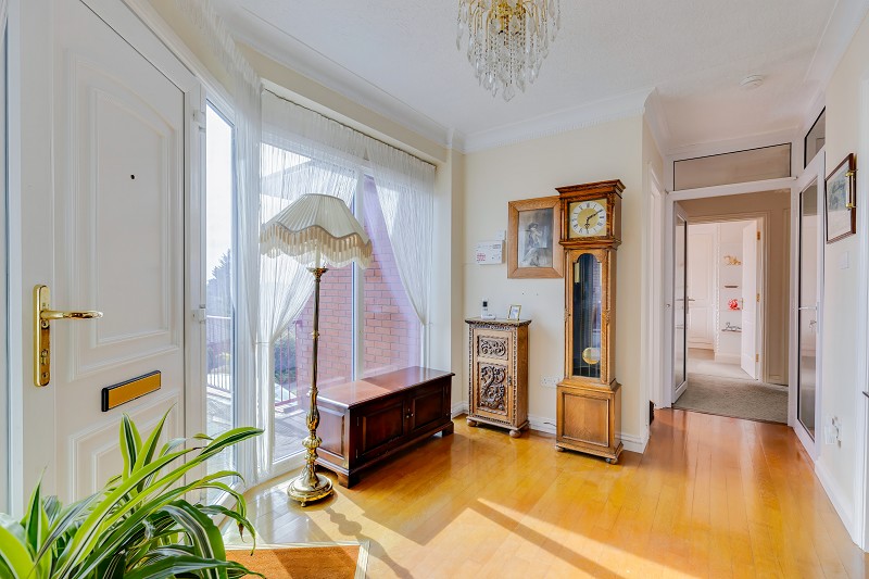 A bright and welcoming hallway is flooded with natural light from full height windows beside the front door.