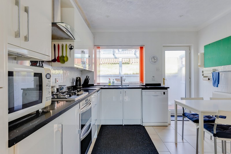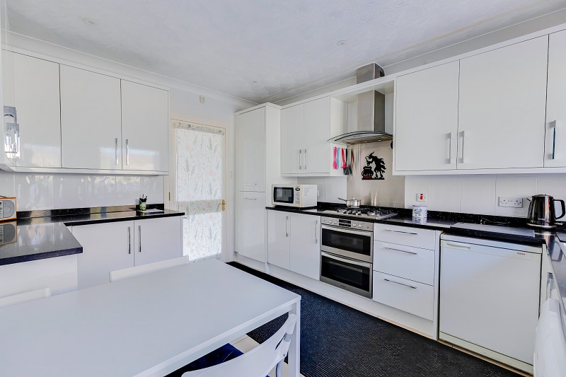 It is well equipped with integrated appliances including a double oven, gas hob and extractor, together with space for a breakfast table and chairs.