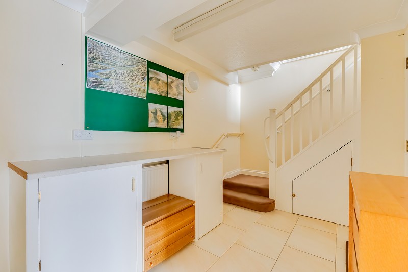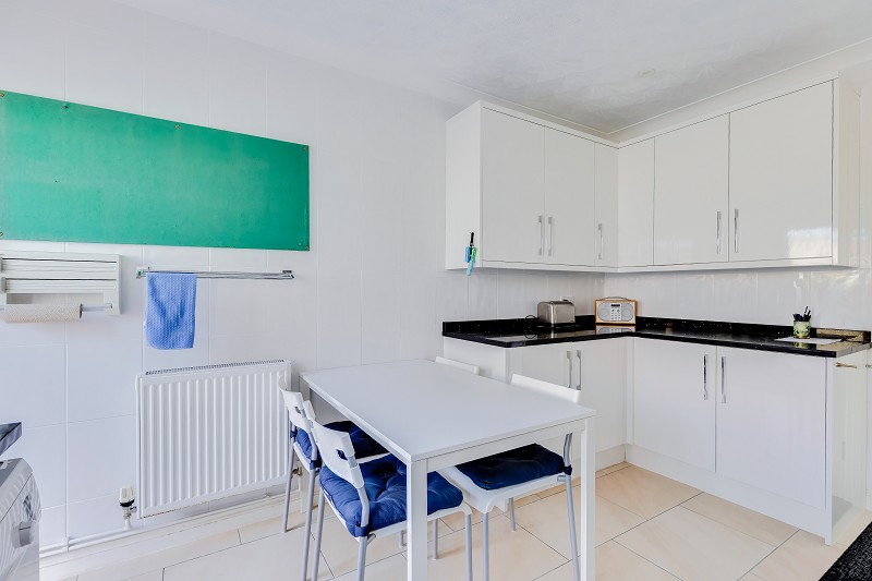 This useful space is fitted with additional cupboards and work surfaces, as well as space for white goods.