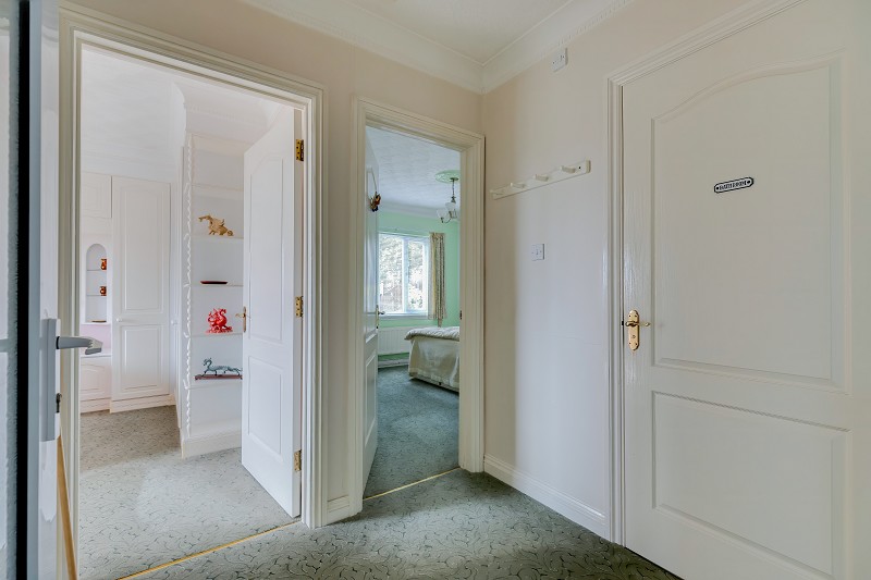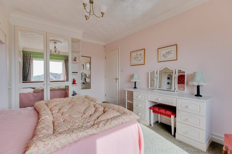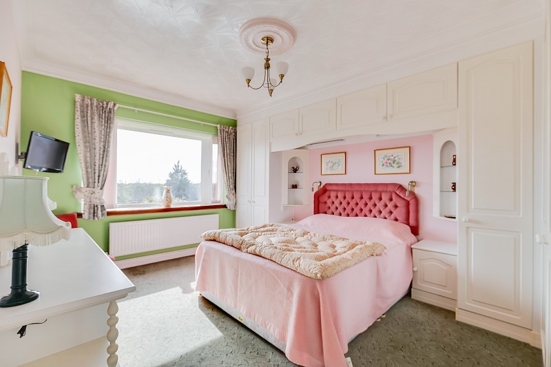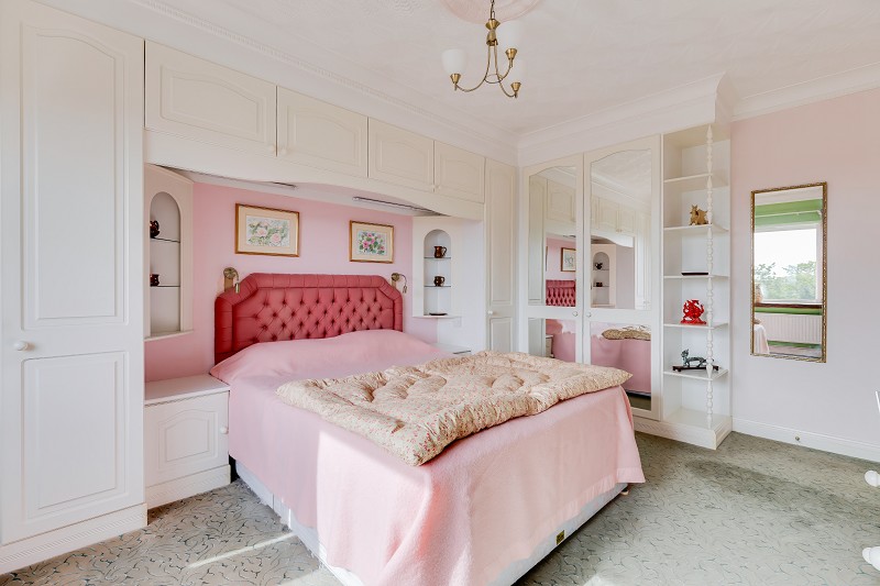 The main bedroom is a spacious double with an extensive range of fitted wardrobes, overhead storage, and display shelving.