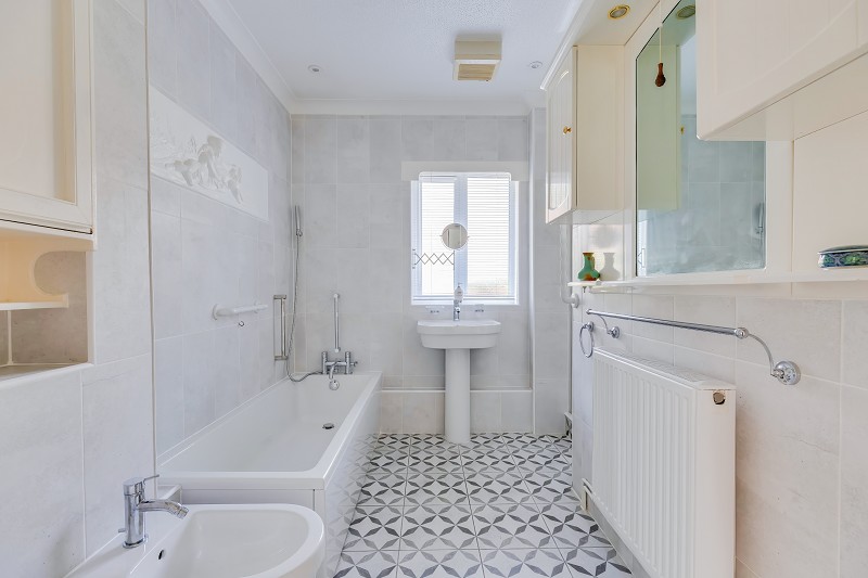 The principal bathroom is finished in a light contemporary style, featuring full tiling and patterned flooring.