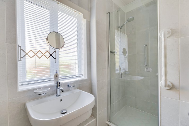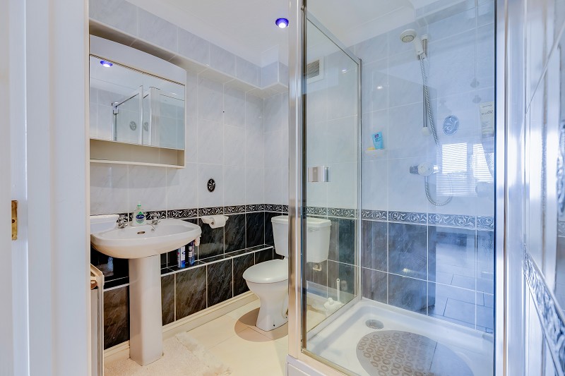 The en-suite comprises a tiled shower enclosure, pedestal wash basin, and WC.
