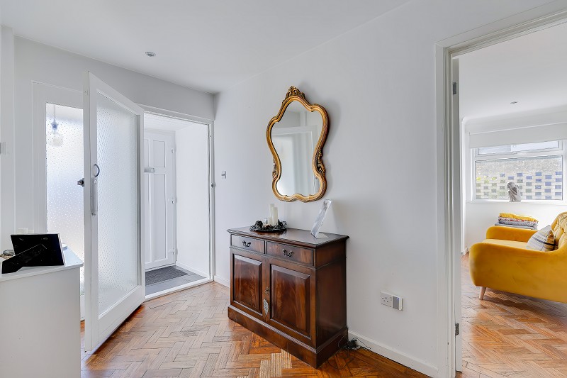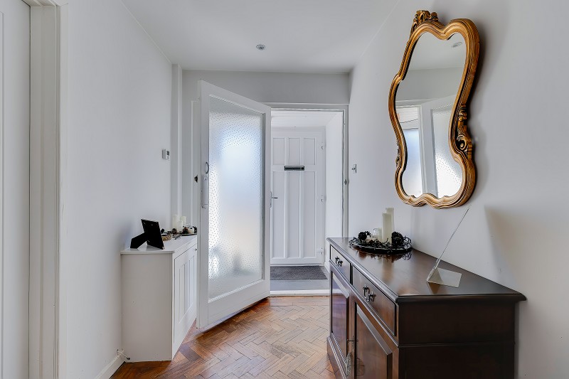 Inside, the porch opens into a welcoming hallway with original parquet flooring and a useful cloaks cupboard.