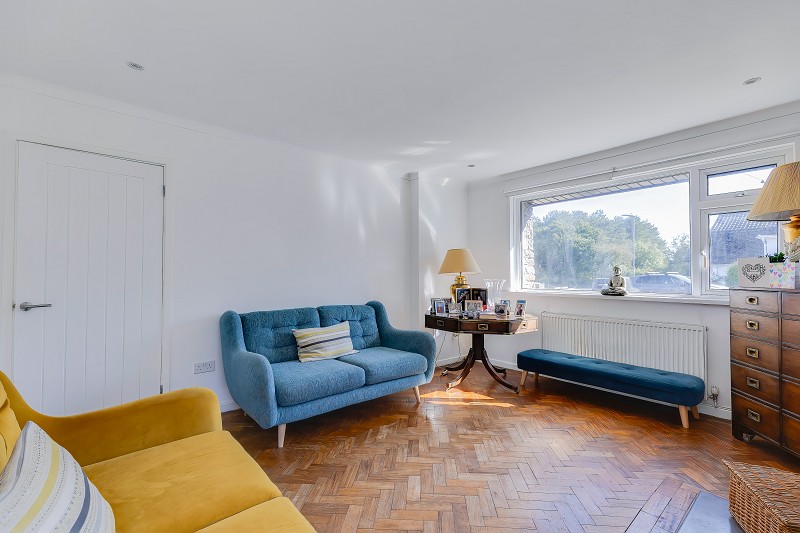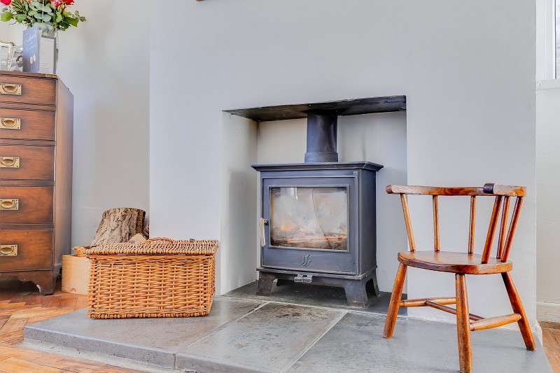 A light and inviting living room with dual aspect windows, original parquet flooring and a recessed fireplace housing a wood burning stove on a slate hearth.