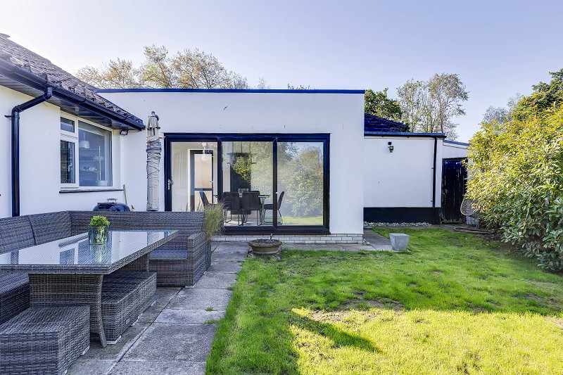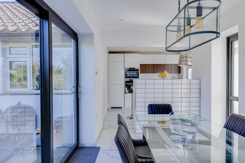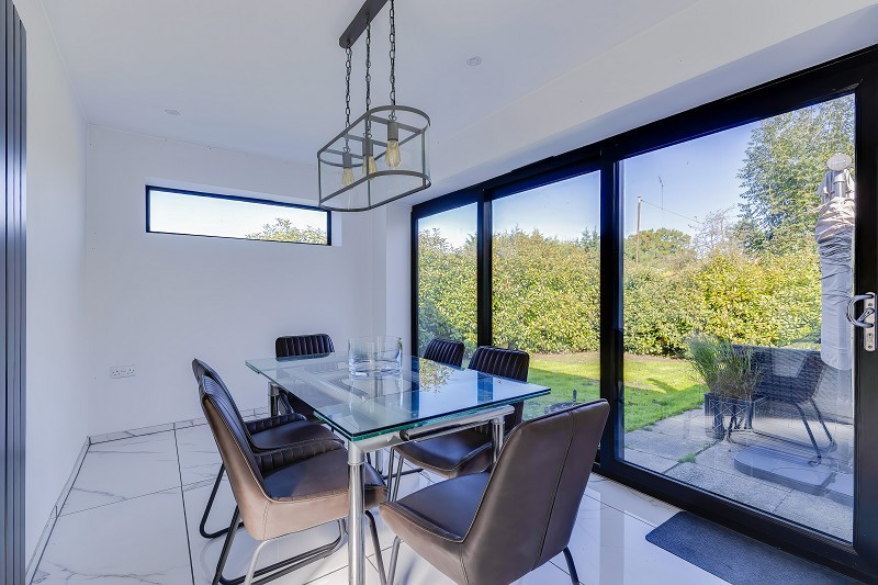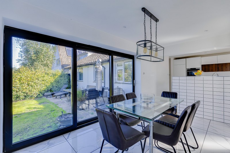 The adjoining dining area is bright and spacious, with full-height window and sliding doors opening directly to the garden.