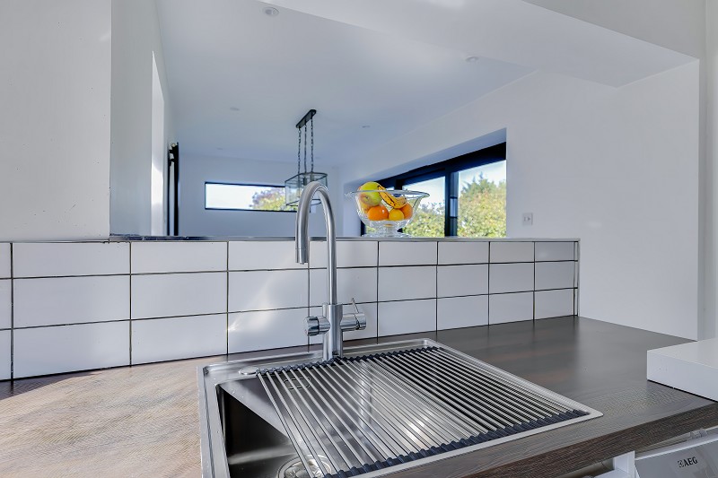 The heart of the home is a striking open-plan kitchen and dining space, finished in a sleek, contemporary style.