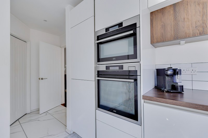 Integrated appliances include double ovens, induction hob, microwave, fridge/freezer and dishwasher, with space and plumbing for a washing machine.