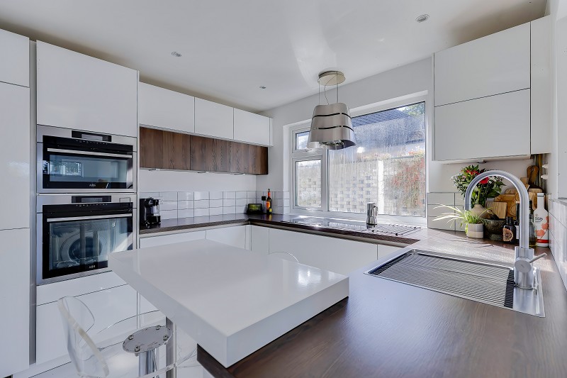 A breakfast bar with seating and feature pendant lighting adds further style and practicality.