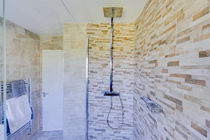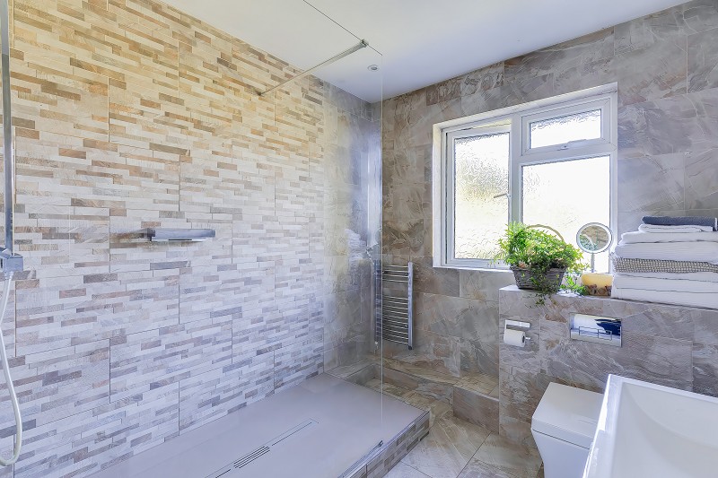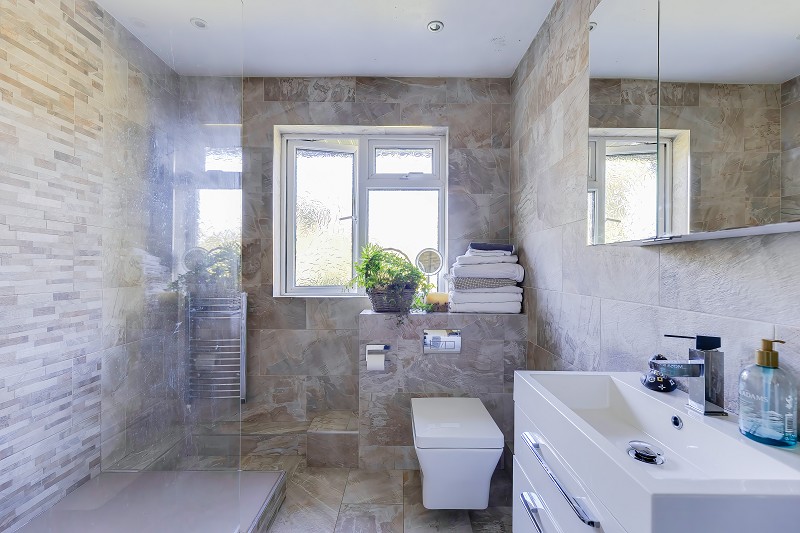 Stylish and contemporary, the bathroom features full-height natural stone-effect tiling and a large walk-in shower enclosure with rainfall showerhead and glazed screen.