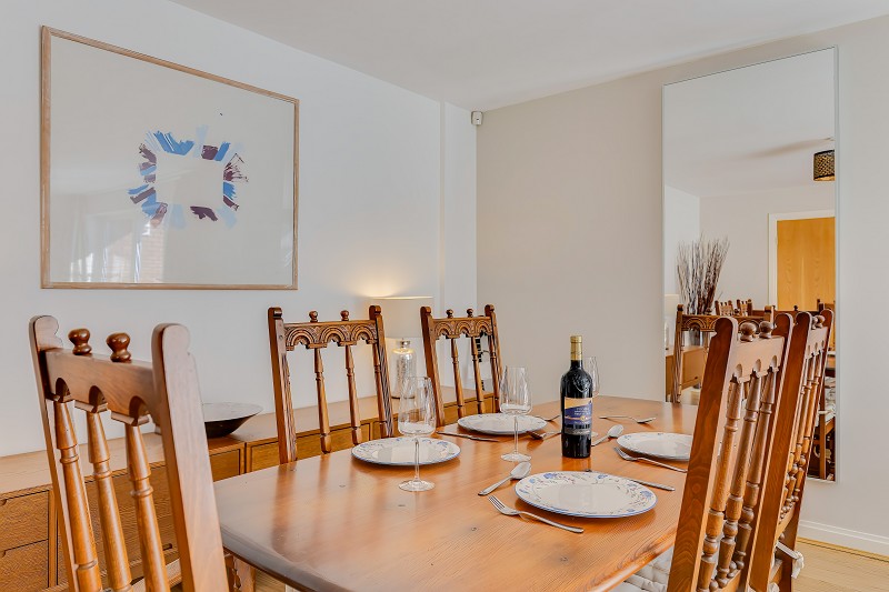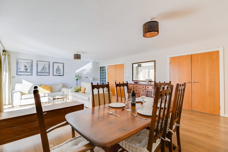A superb open-plan living and dining area featuring full-height glazed doors that open onto a private balcony with contemporary glass and steel balustrade.