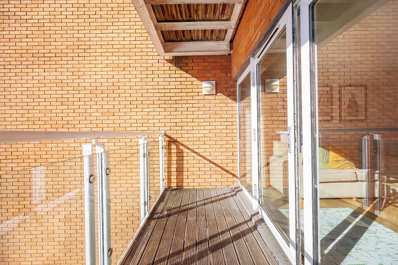 Accessed via glazed doors, the second private balcony features timber decking and a glass-panelled balustrade.