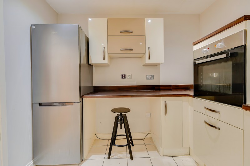 A modern fitted kitchen appointed with a range of gloss-finish cabinets, wood-effect work surfaces and tiled flooring.