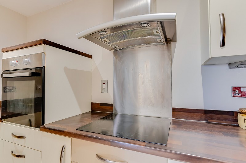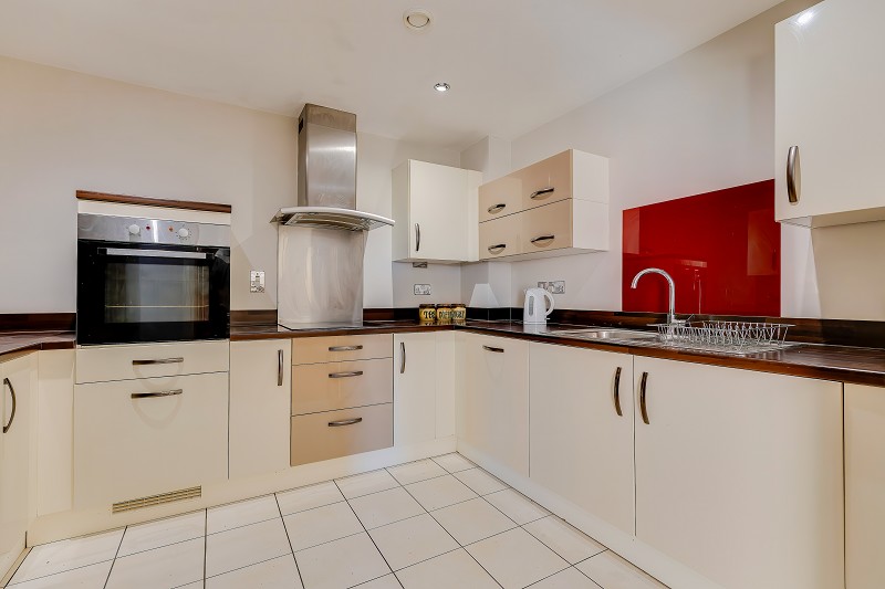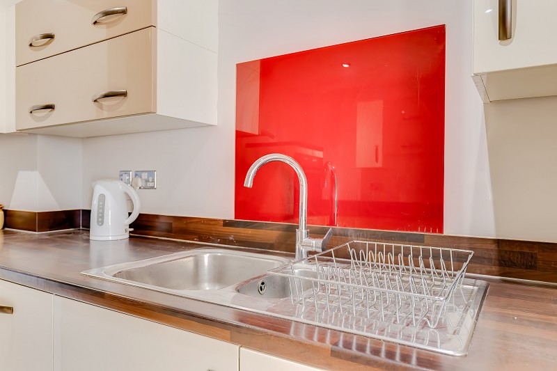 Integrated appliances include an oven, hob with stainless steel extractor hood, and sink with mixer tap set beneath a bold red glass splashback.