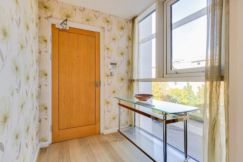 A window at the entrance allows natural light to flow through the hallway and there is an intercom entry system for added security.