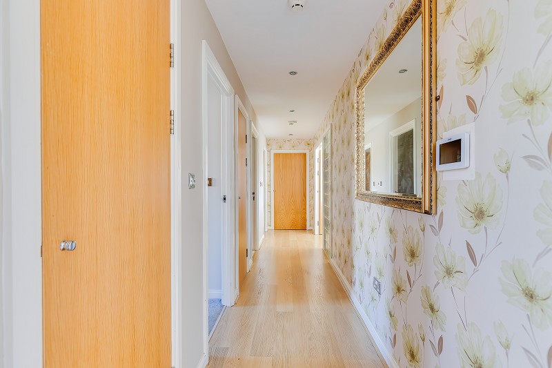 A welcoming and spacious entrance hall with wood-effect flooring, floral feature wallpaper create a stylish first impression.