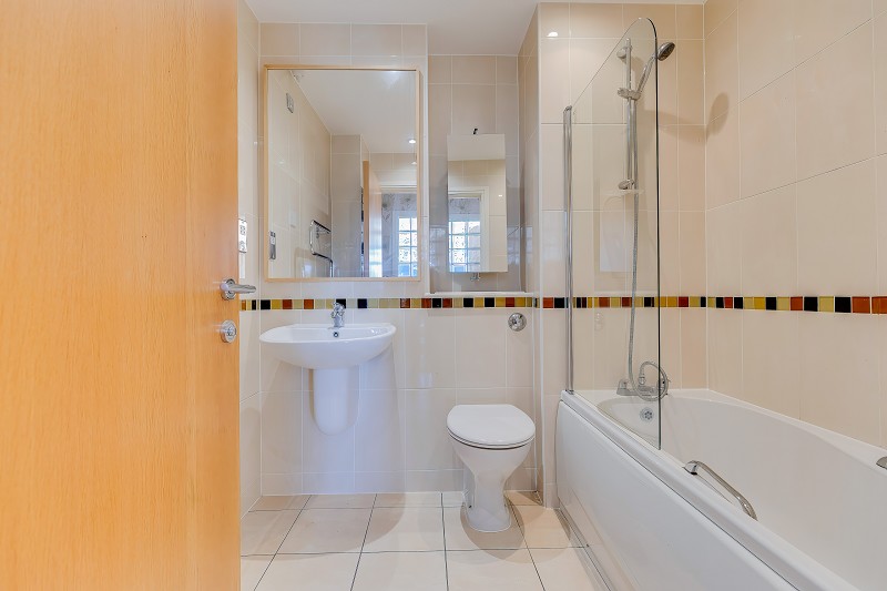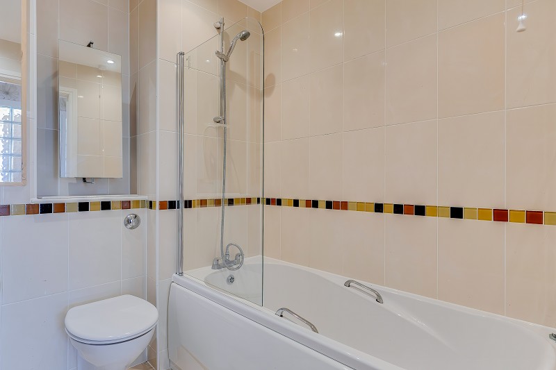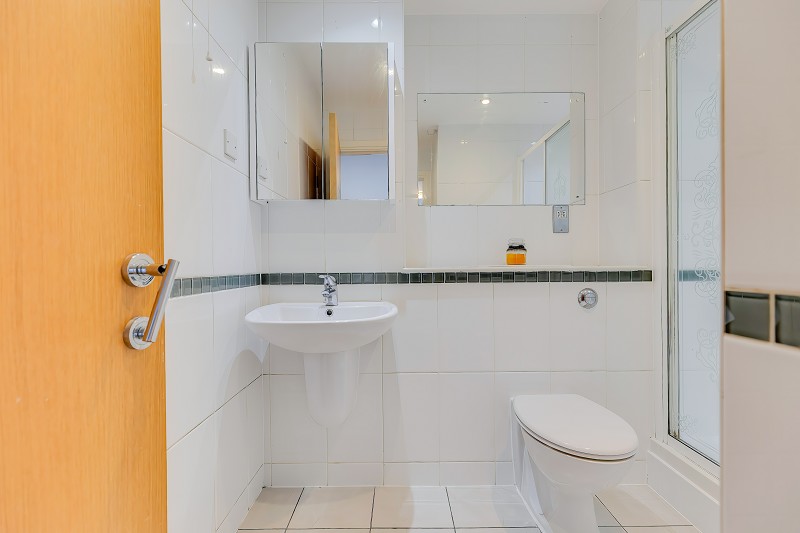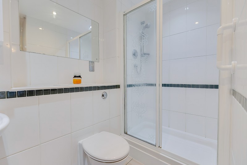 The en-suite shower room is fully tiled and features a glazed shower enclosure, wash hand basin, WC and mirrored storage cabinet, all finished in a modern style.