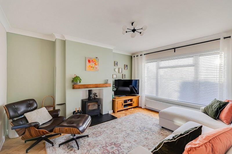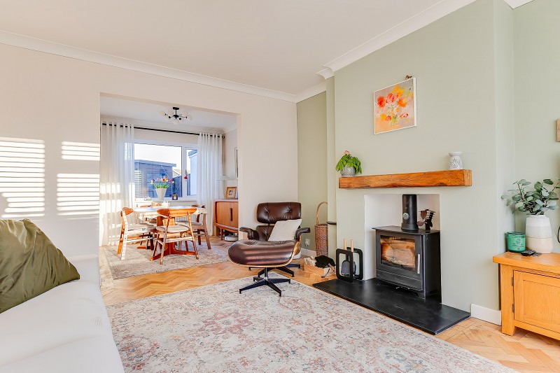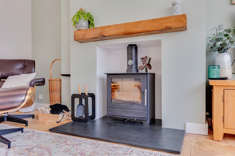 The focal point is the recently installed 4.9 kW wood burner set within a recessed chimney breast on a slate hearth with chunky oak mantle above.