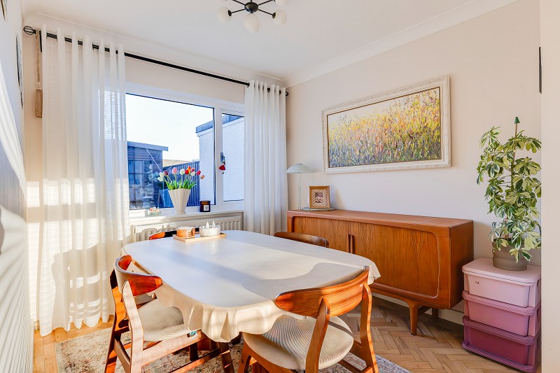 Comfortable family dining area with ample room for a table and sideboard, ideal for everyday use and entertaining.