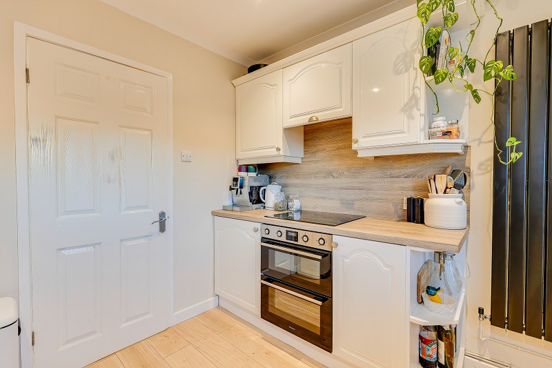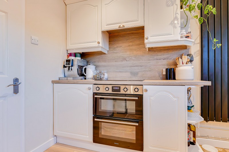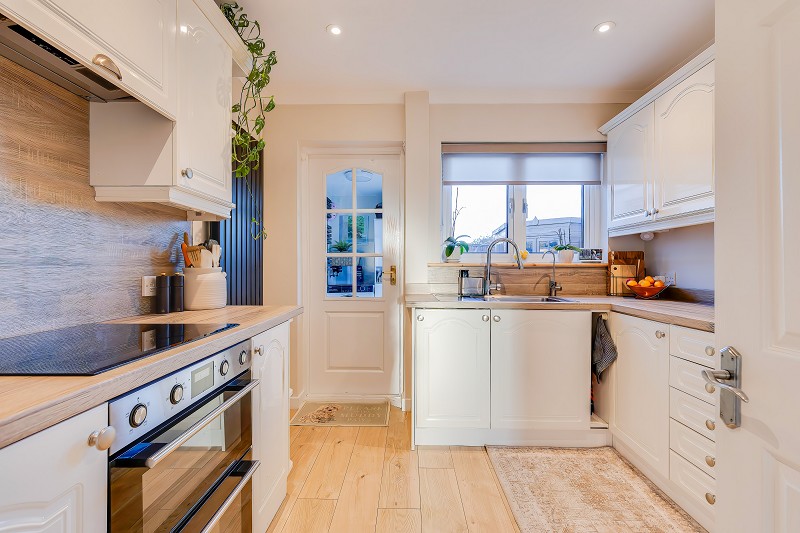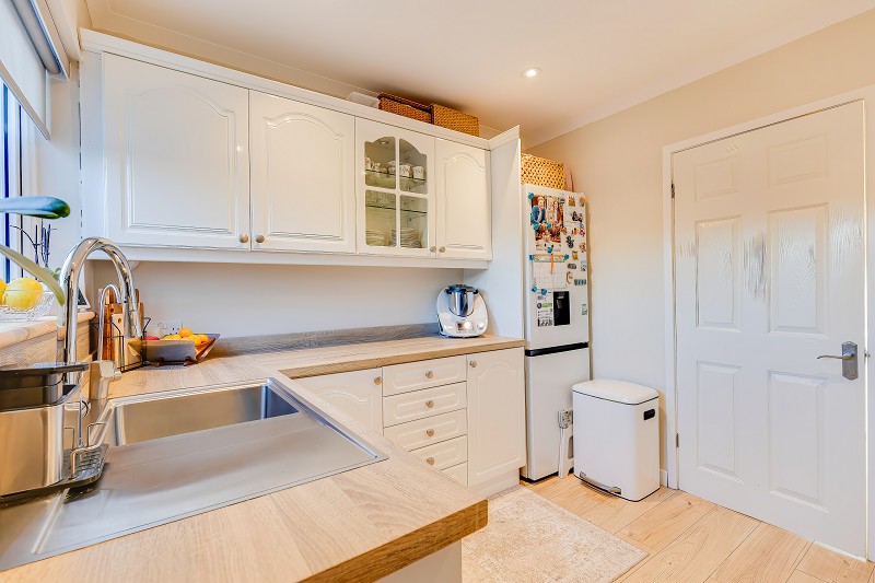 Well appointed kitchen fitted with cream fronted cabinets and wood effect work surfaces arranged in an L shape to maximise storage and preparation space.