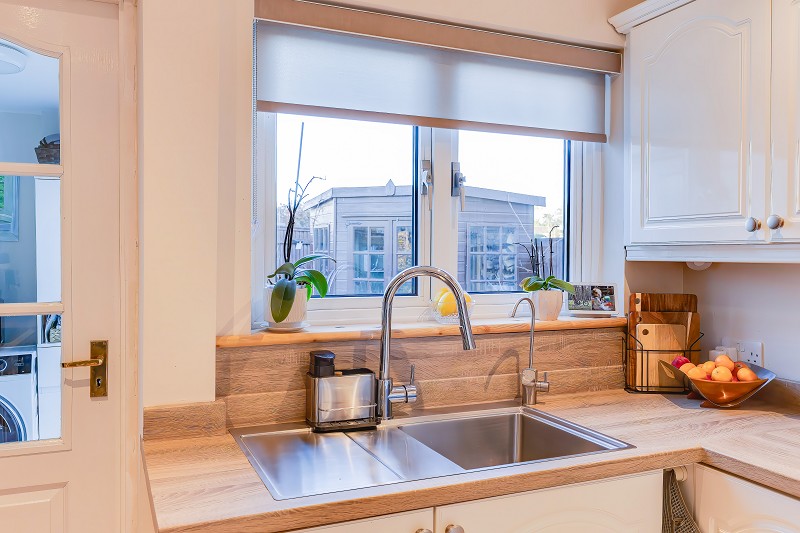 Inset stainless steel sink with mixer tap and separate filtered cold water tap with digital display set beneath a rear window enjoying an outlook over the garden.