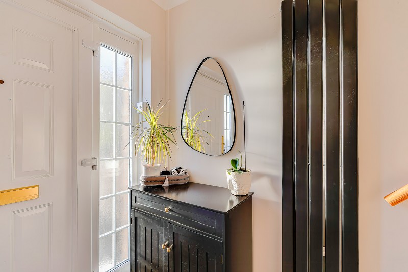 A bright welcoming hallway with contemporary white front door and glazed side panel allowing plenty of natural light.