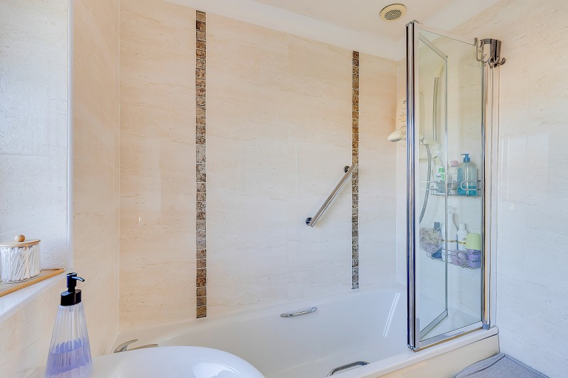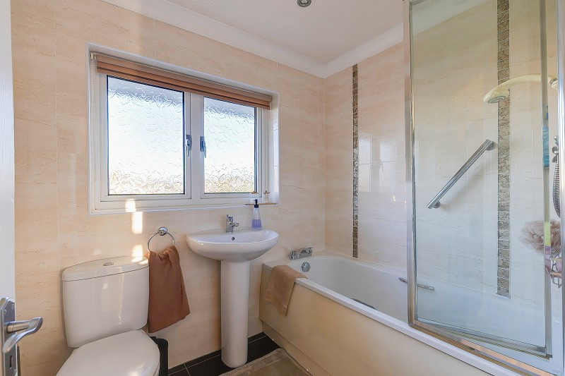 Fitted with a panelled bath with mixer tap, wall mounted shower over and glazed shower screen, pedestal wash hand basin and close coupled WC.