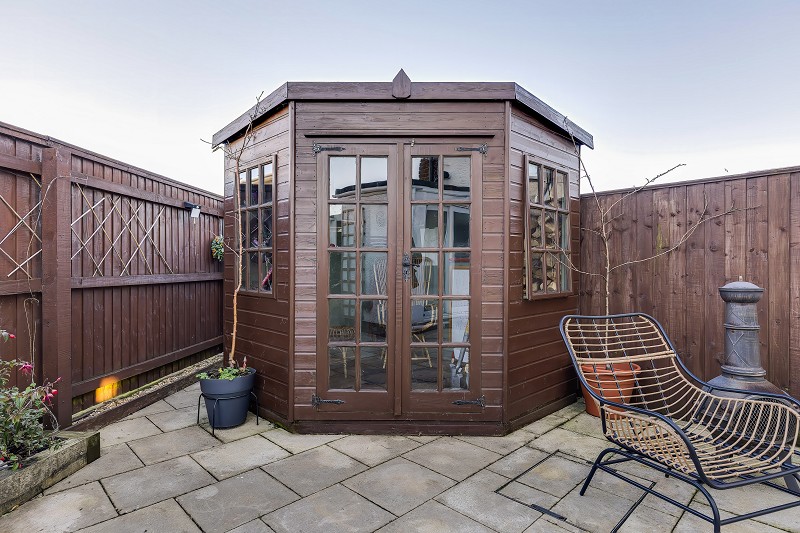 There is a summer house and room for pots and planters which add interest.