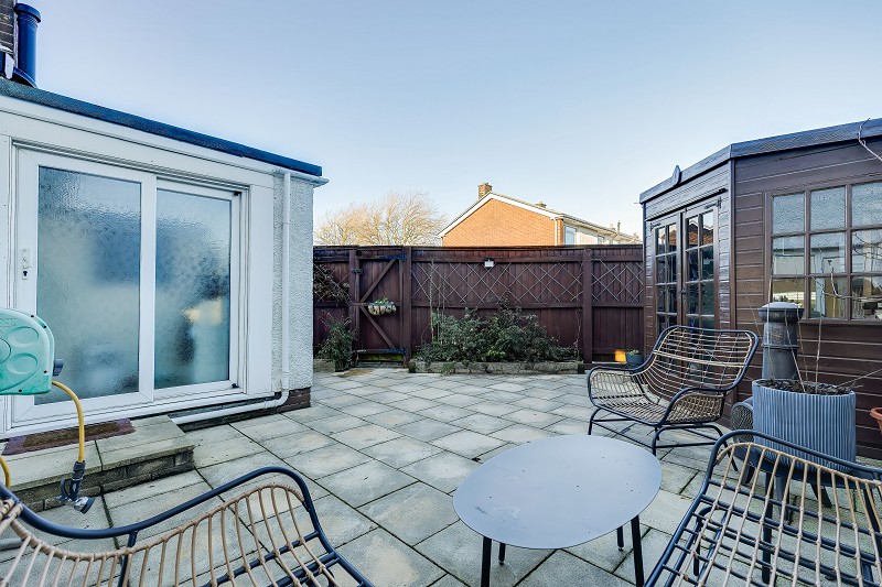 To the rear is a smart fully paved courtyard style garden.