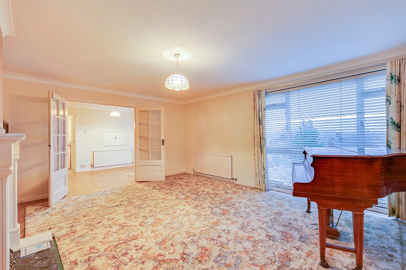 A spacious and light filled living room enjoying elevated southerly views across the village through a large picture window with fitted blinds and curtains.