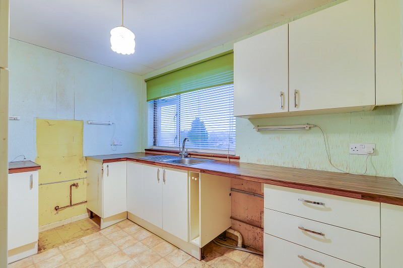The kitchen is dated and offers clear potential for updating and reconfiguration.