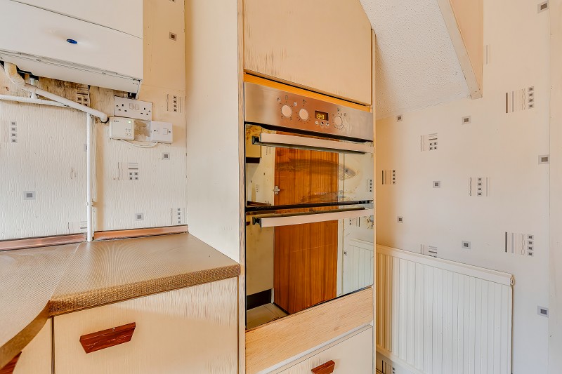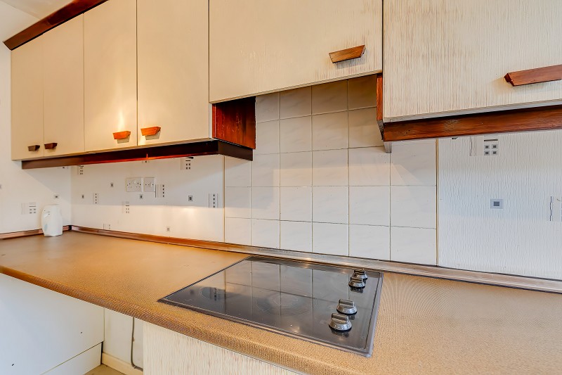 Good sized kitchen fitted with a range of wall and base cabinets in a light finish with contrasting work surfaces and tiled splashbacks.