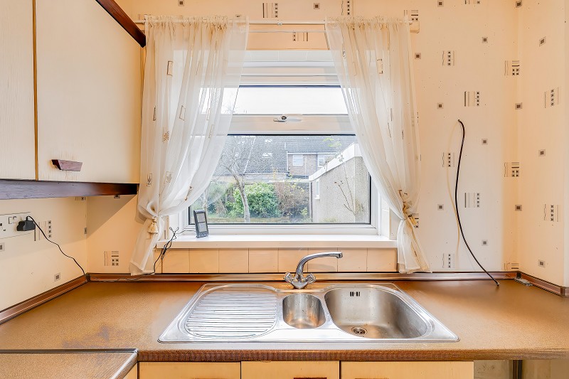 Stainless steel sink and drainer beneath the rear window overlooking the garden.