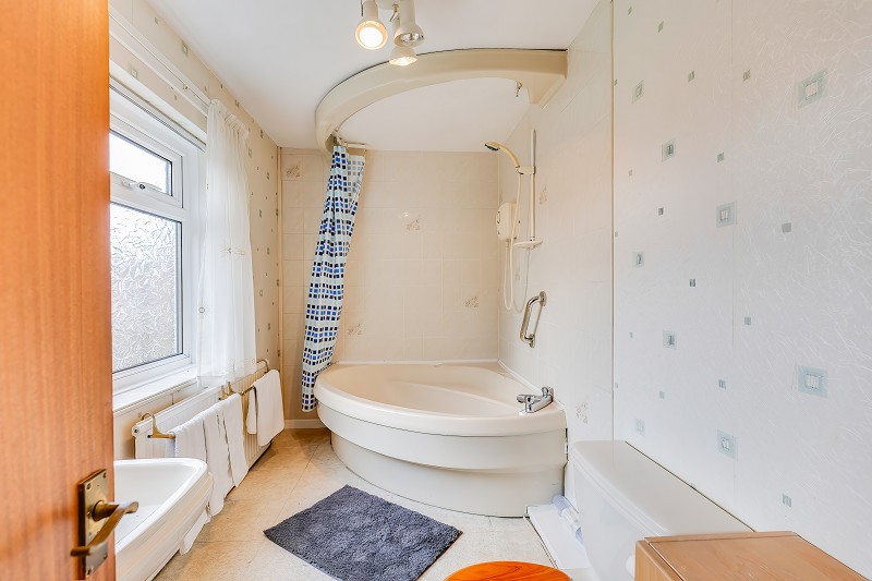 Light en-suite featuring a corner bath with electric shower over., WC and wash hand basin.