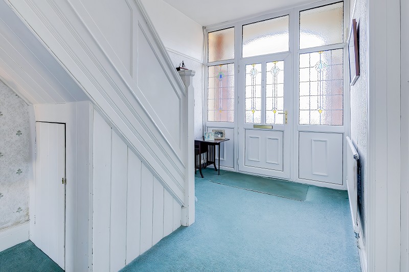 The hallway has a high ceiling, coving and a carpeted floor with original wood block flooring understood to be retained beneath.