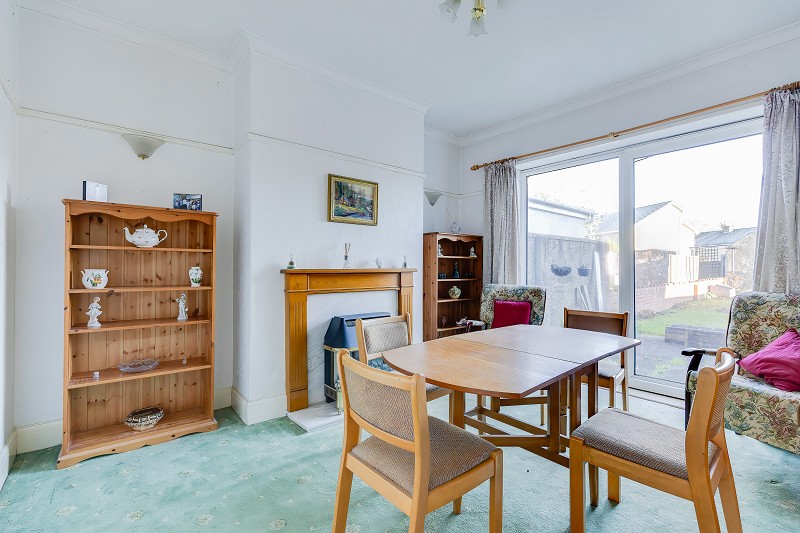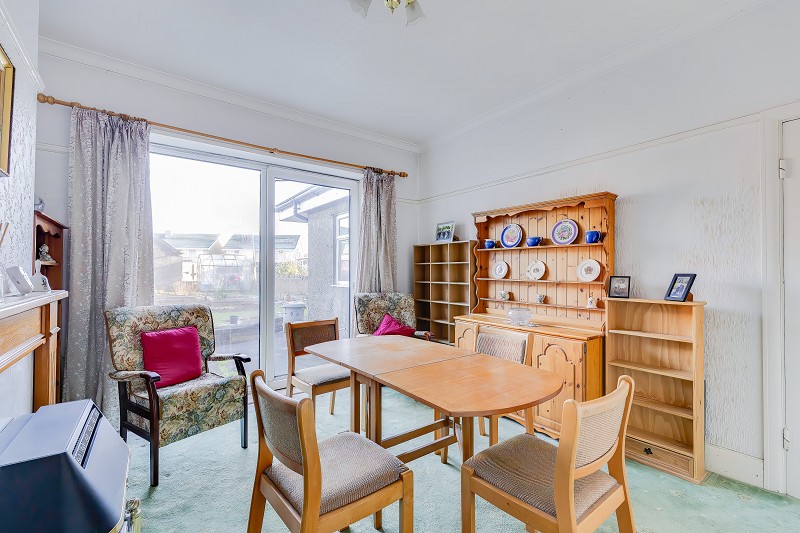 A separate dining room positioned to the rear with a large sliding glazed patio door opening directly onto the garden.