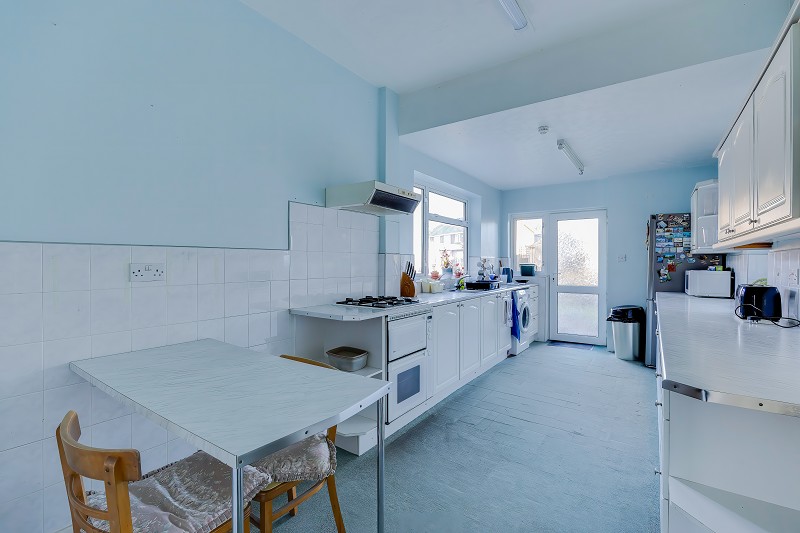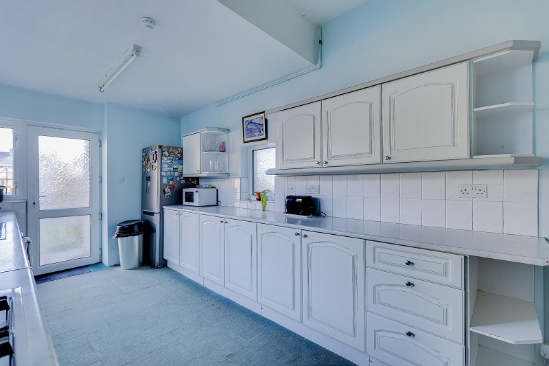 Natural light is provided by a wide UPVC double glazed window over the sink and a UPVC part glazed external door leads out to the rear.