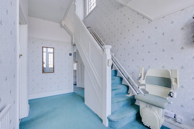 The staircase features painted timber panelling to the side together with a newel post and handrail.