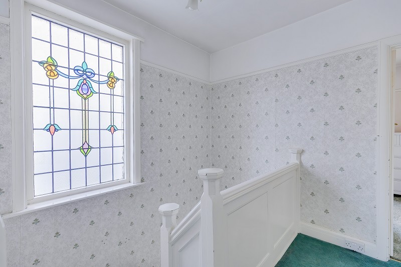Character features include leaded stained glass detailing and original wood block flooring understood to be retained beneath fitted carpets within the hallway and reception areas.