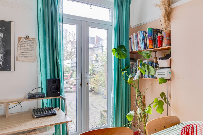French doors opening onto the garden and wood effect flooring.