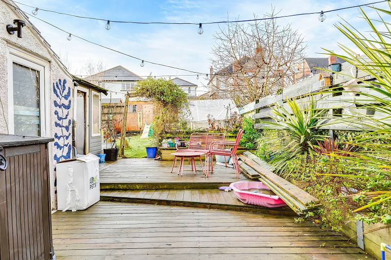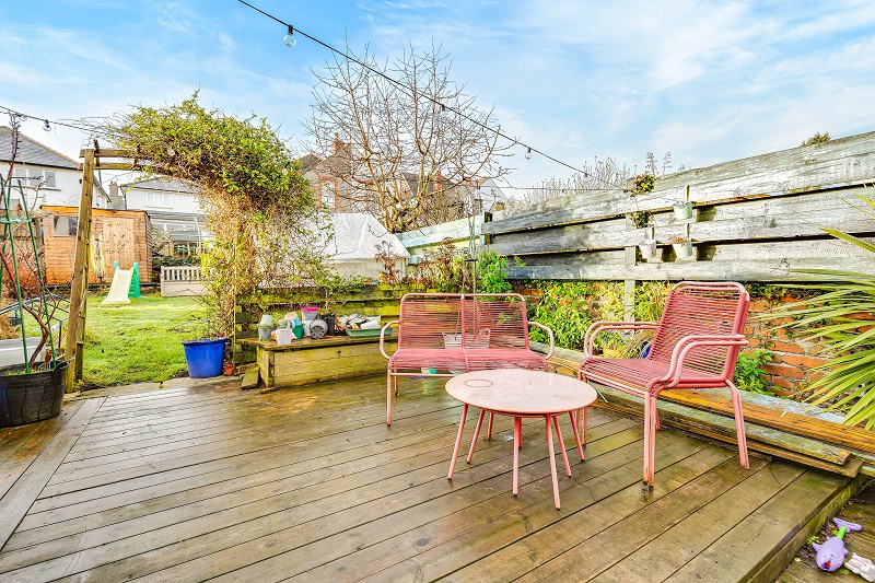 Immediately behind the property there is a raised decked seating terrace with steps down to a lawn.