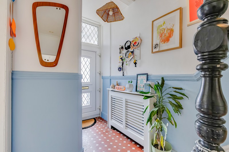 Period style tiled flooring, painted dado rail and a staircase rising to the first floor.
