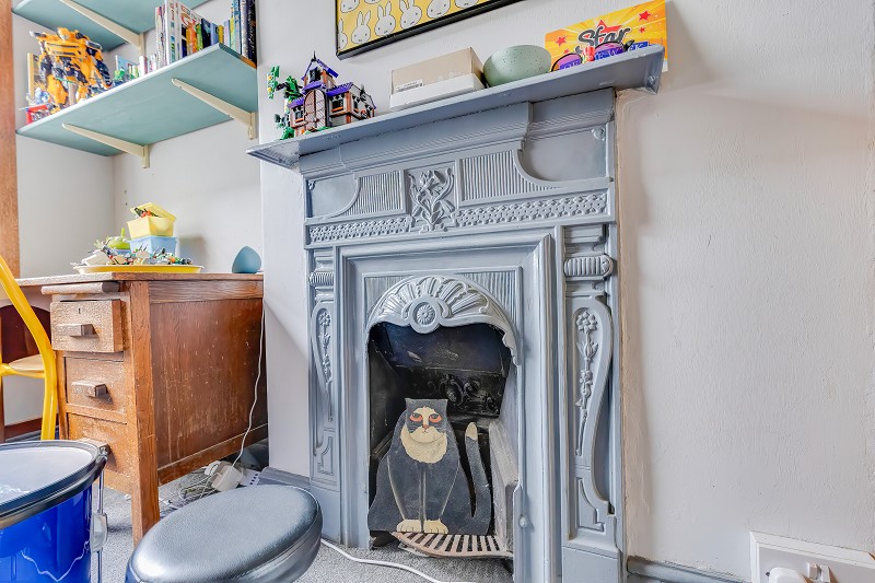 Fitted carpet and period, cast iron fireplace.