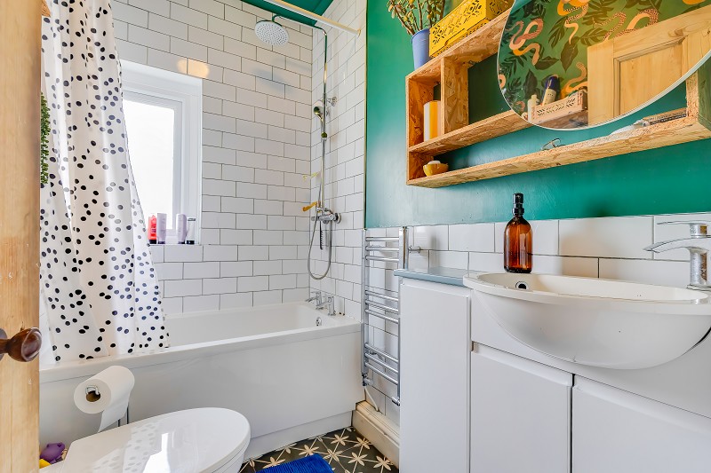 Finished with metro style tiling, a window for light and ventilation and a ladder style heated towel rail.